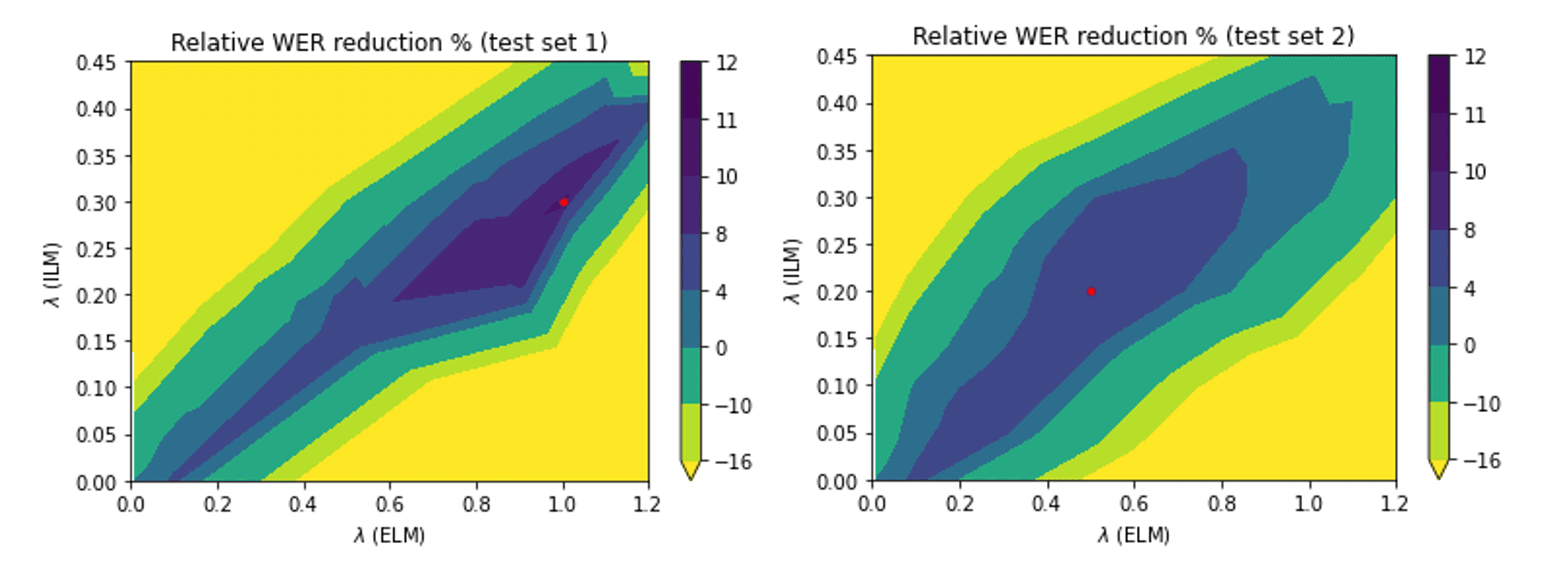 As we touched on earlier, to integrate the external LM effectively the two parameters λ₁ and λ₂ must be chosen carefully. These correspond to the external Language Model and Internal Language Model respectively.