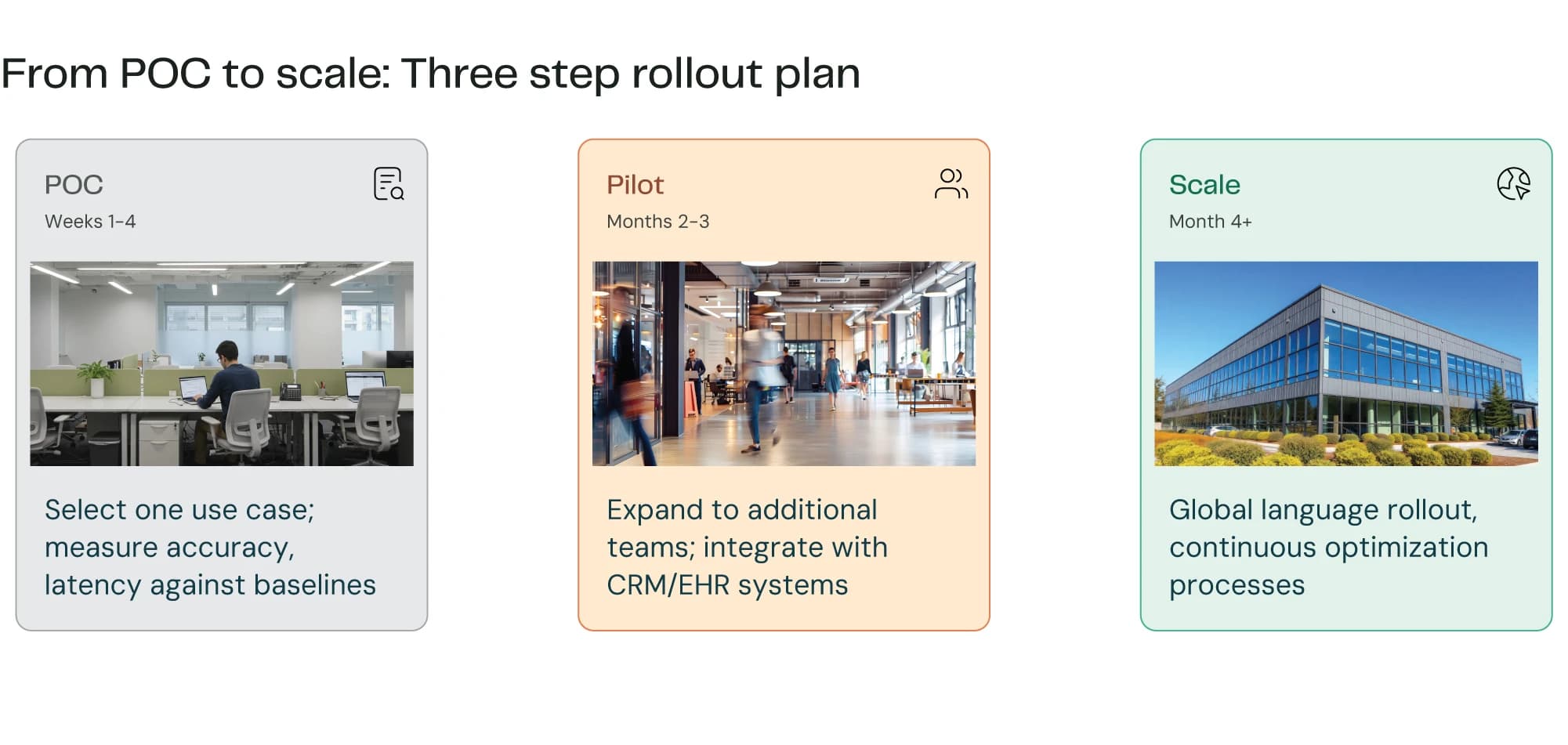 Three-phase deployment: POC in 4 weeks, pilot in 2-3 months, full scale by month 4.