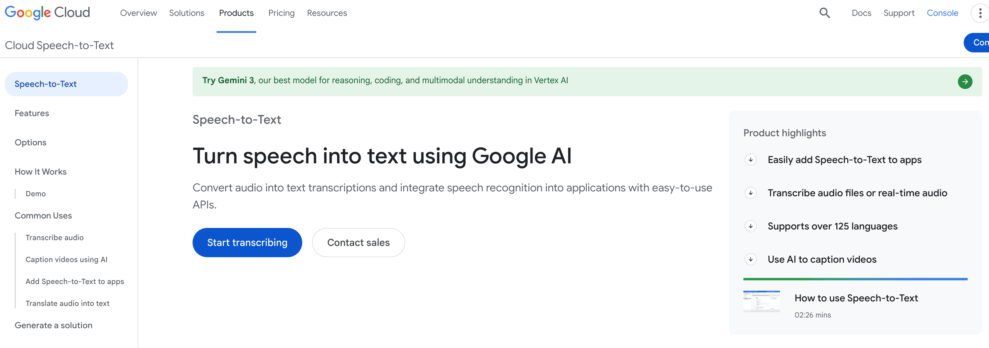 Google Cloud Speech-to-Text is a managed STT service built into the Google Cloud Platform. The V2 API introduces reusable recognizers, fully regionalized service invocation, and the Chirp 3 model with a built-in denoiser, speaker diarization, speech adaptation, and automatic language detection. For GCP-native teams, ecosystem fit is a genuine advantage: identity, networking, procurement, and monitoring all connect to existing infrastructure.