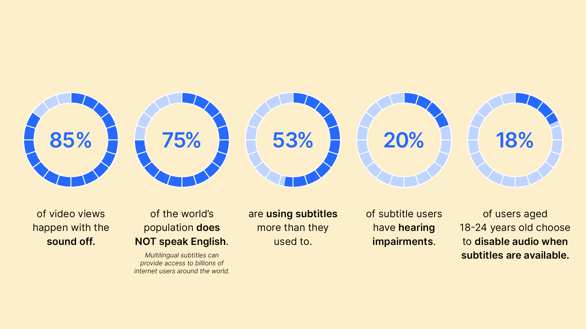 Producing content isn’t easy, or cheap. For every piece of content created, creators want the broadest possible audience. A broad audience means more views, more engagement, wider reach, and given that 5.5 billion people do not speak English (and that’s just English) – providing captions and subtitles in additional languages can ensure that your content is consumable by a much wider audience.