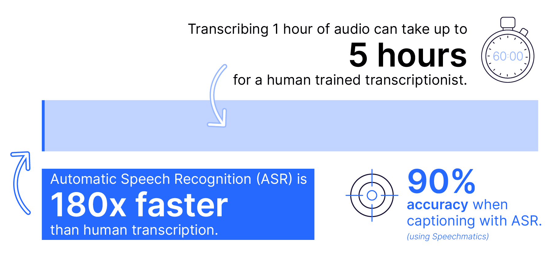 This means that vast amounts of media can be transcribed (and therefore captioned) in a fraction of the time it would take for humans to complete the job: