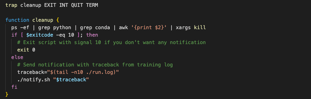 Even with careful implementation, it is unlikely your job will run the first time with no errors. It's important to be notified if errors occur so they can be handled efficiently, and training can be resumed as soon as possible. To achieve this, set up a webhook to send a message if the process exits. Use the trap command in bash to catch signals, then execute a simple function to cleanup hanging processes on the nodes and send an alert.
