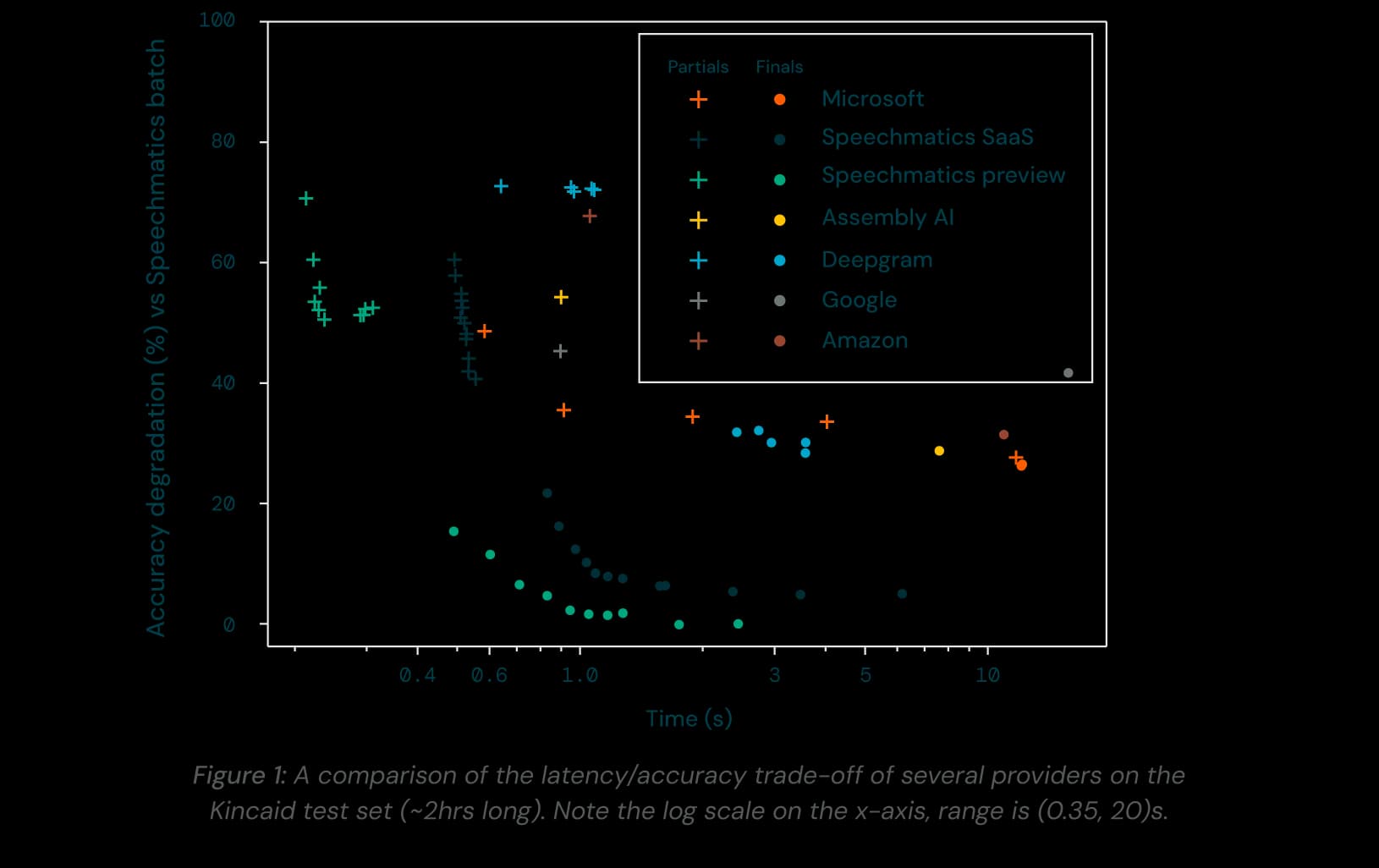 Below illustrates a comparison of the latency and accuracy trade-off of several providers on the Kincaid test set (~2hrs long). Note the log scale on the x-axis, range is (0.35, 20)s.