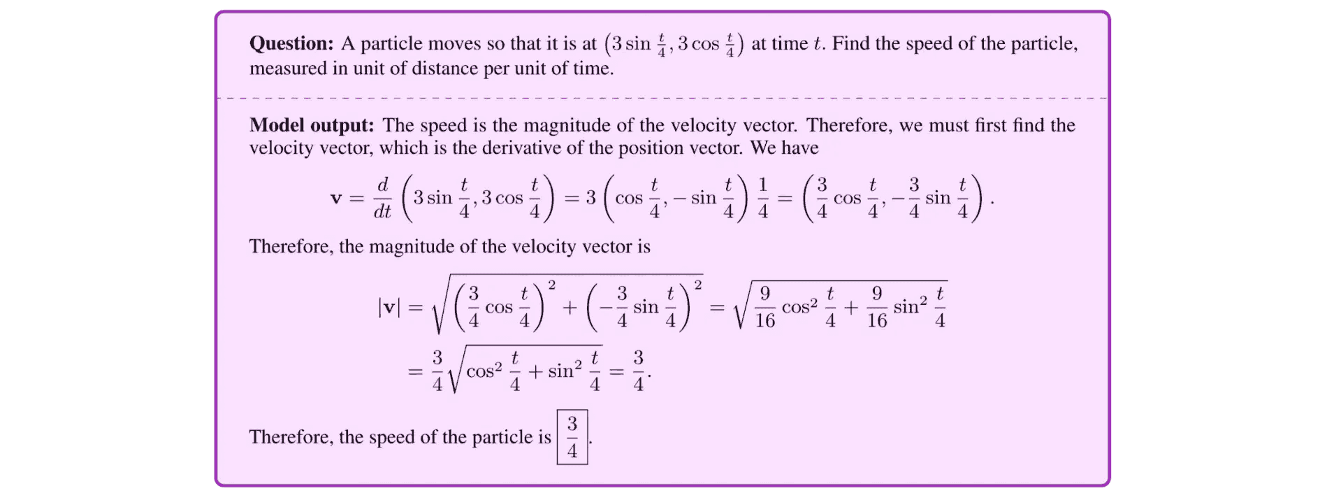 In April, Google trained a model called Minerva that solves high school maths problems such as knowing how to differentiate the position vector of a particle to find its speed (shown in the figure below). They achieved 50.3% accuracy on the MATH dataset which smashes the previous SOTA result of 6.9%. This is a level of quantitative reasoning that ML forecasters didn’t believe was possible for the next 3 years (see their estimates here) without significant advances in model architecture or training techniques.