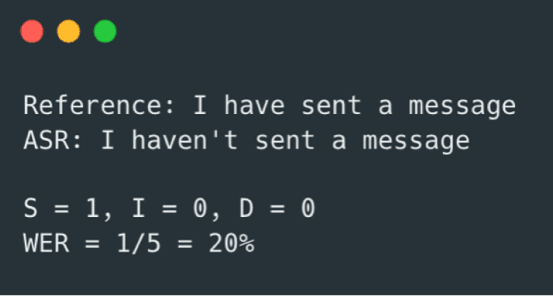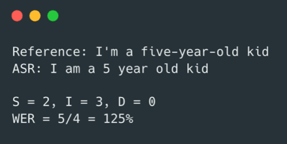 To the human eye, there doesn’t appear to be much wrong with this output. Conversely, this has a high WER of 125%! There are two substitution errors (‘I’ for ‘I’m’ and ‘5’ for ‘five-year-old’) and three insertions (‘am’, ‘year’ and `old’). The WER is greater than 100% because there are more errors than words in the reference.