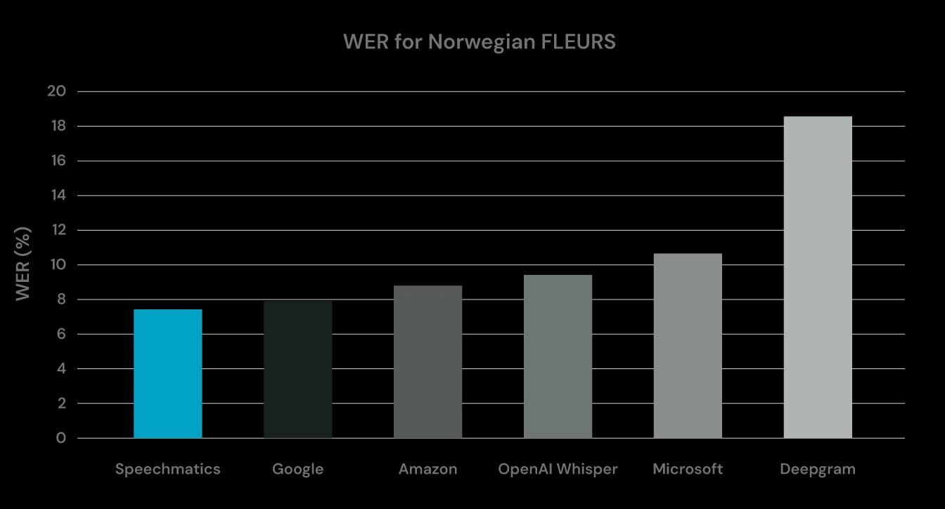 The above graph shows the Word Error Rate (WER) for the Norwegian FLEURS open dataset across key ASR providers.