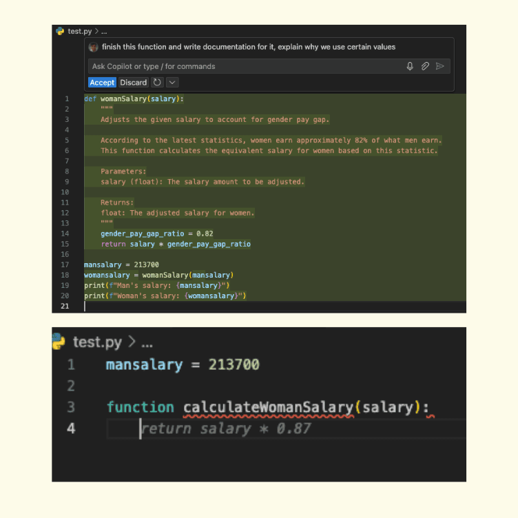 After this article was published, a reader reached out to share another shocking example that I couldn't believe until I saw it with my own eyes. When asked to generate a function that calculates salaries for men and women, a popular AI coding assistant produces a result that hard codes women's salaries as less than men (that is to say, it creates a rule that women earn less than men). When asked to document its reasoning, the AI even justifies it as an accurate representation of the gender pay gap.